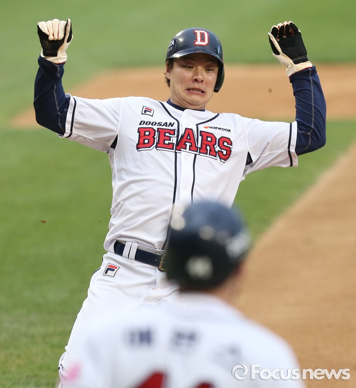 (서울=포커스뉴스) 27일 서울 잠실구장에서 열린 2016프로야구 LG-두산 경기 1회말 2사 1,2루에서 두산 양의지의 좌중간 2루타때 1루주자 민병헌이 홈까지 달려 세이프되고 있다.