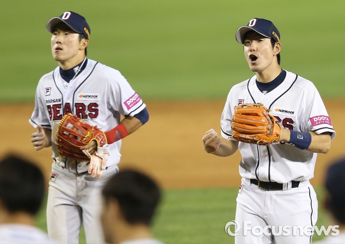 (서울=포커스뉴스) 27일 서울 잠실구장에서 열린 2016프로야구 LG-두산 경기에서 LG에 승리한 두산 허경민(왼쪽)과 김재호가 경기를 마치고 환호하고 있다.