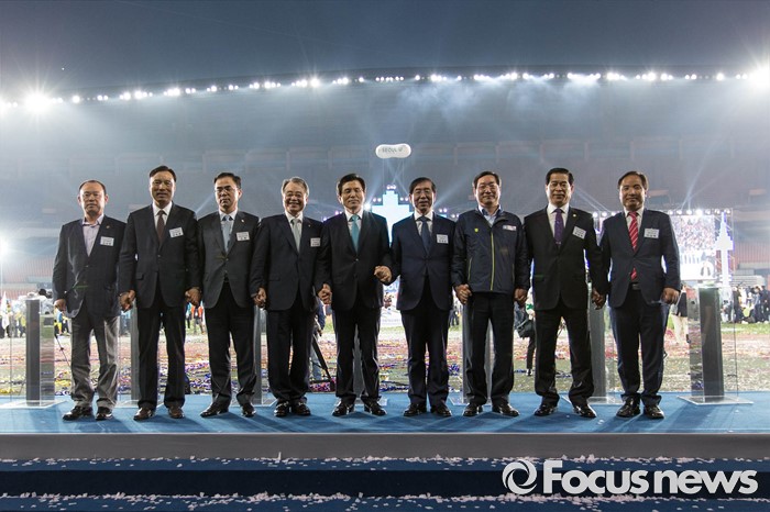 (서울=포커스뉴스) 2016 전국생활체육대축전 개막식이 열린 27일 오후 서울 송파구 잠실 올림픽주경기장에서 내빈들이 손을 맞잡고 사진촬영을 하고 있다. 왼쪽 네 번째부터 강영중 대한체육회장, 황교안 국무총리, 박원순 서울시장.