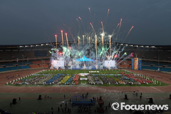 (서울=포커스뉴스) 2016 전국생활체육대축전 개막식이 열린 27일 오후 서울 송파구 잠실 올림픽주경기장에서 개막을 알리는 축포가 터지고 있다.