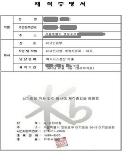 금감원 관계자는 "대출 권유 전화를 받는 경우에는 금감원 홈페이지 등을 통해 해당 금융회사의 실제 존재여부를 우선 확인해야 한다"면서 "금융사 직원 또는 정식 등록된 대출모집인 인지 여부를 금융사에 전화해 반드시 확인해야 한다"고 조언했다.KB국민은행의 재직증명서 위조문서.<자료제공=금융감독원>
