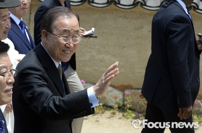 (안동=포커스뉴스) 29일 오후 경북 안동 하회마을을 방문한 반기문 유엔 사무총장이 식수를 위해 이동하며 시민들을 향해 손을 흔들고 있다.