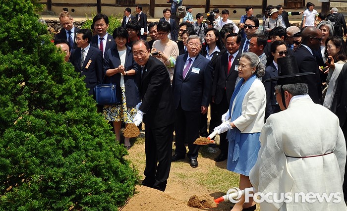 (안동=포커스뉴스) 반기문 유엔 사무총장(오른쪽 두번째) 내외가 29일 오후 유네스코 세계문화유산으로 등재된 경북 안동 하회마을을 방문해 기념 식수를 하고 있다.