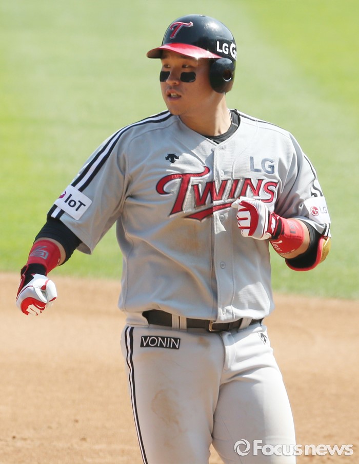(서울=포커스뉴스) 29일 서울 잠실구장에서 열린 2016프로야구 LG-두산 경기 3회초 2사 만루에서 LG 유강남이 2타점 역전 안타를 치고 기뻐하고 있다.
