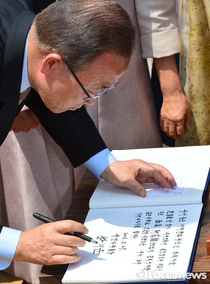 (안동=포커스뉴스) 반기문 유엔 사무총장이 29일 오후 경북 안동 하회마을의 서애 류성룡 고택을 방문, 김관용(오른쪽) 경북도지사와 김광림(왼쪽) 새누리당 정책위의장, 류왕근 하회마을 보존회 이사장 등 관계자들이 지켜보는 가운데 방명록을 쓰고 있다.