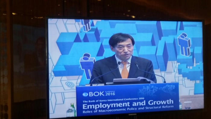 30일 오전 서울 소공동 웨스틴조선호텔에서 열린 '2016년 한국은행 국제컨퍼런스'에서 기조 연설자로 나선 이주열 총재는 "각국이 경제 활력을 강화하기 위해 갖가지 비전통적 수단을 동원하는 등 적극 노력하고 있음에도 경제 회복이 지연되는 것은 구조적 변화가 발생했다는 방증"이라고 덧붙였다.