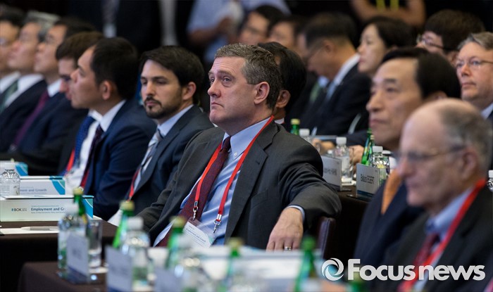 (서울=포커스뉴스) 30일 오전 서울 중구 웨스틴조선호텔에서 열린 2016 한국은행 국제컨퍼런스에서 제임스 불라드 세인트루이스 연은 총재가 주민 국제통화기금(IMF) 부총재의 기조연설을 경청하고 있다.