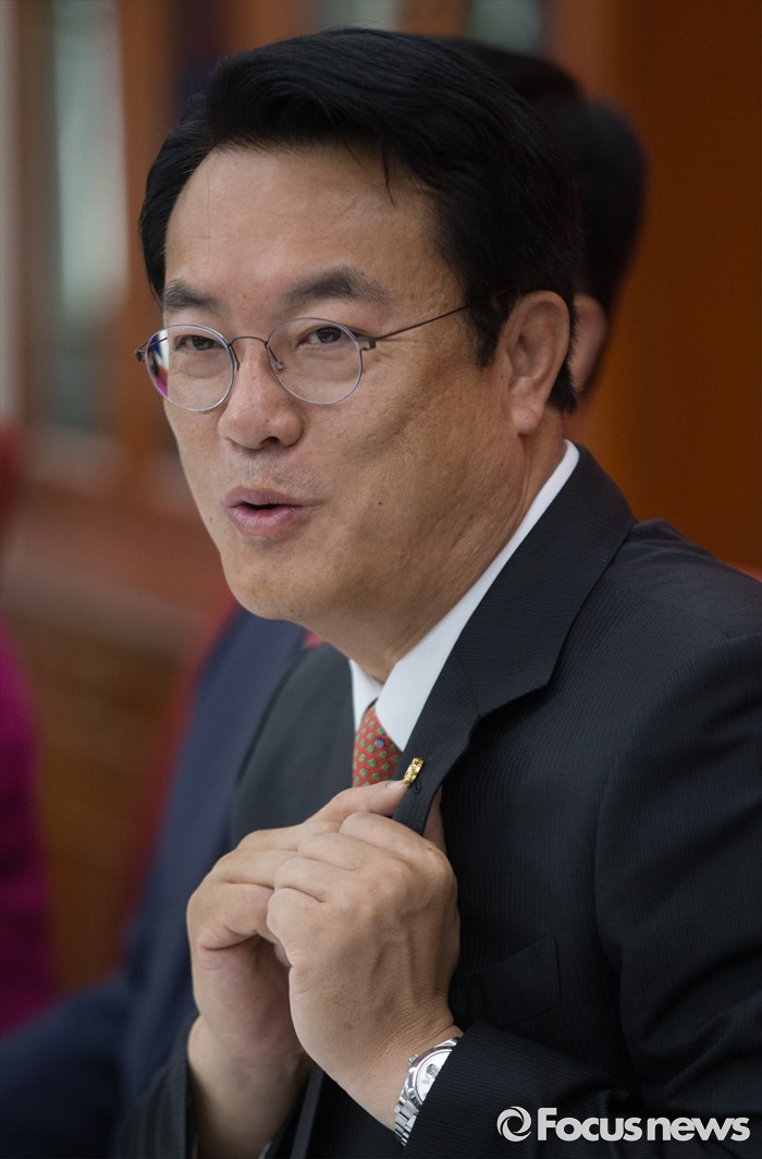 (서울=포커스뉴스) 정진석 새누리당 원내대표가 30일 오전 서울 여의도 국회에서 열린 새누리당 원내대책회의에 참석해, 의원 배지를 보이며 20대 국회의원으로서 자부심을 갖기 위해 꼭 착용하자고 의원들에게 당부하고 있다.