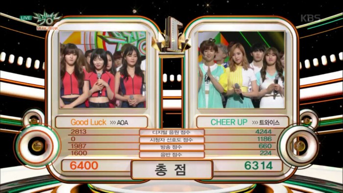 앞서 27일 방송된 KBS2TV ‘뮤직뱅크’(CP 한경천, 연출 김상미‧신미진)에서는 걸그룹 AOA가 ‘굿럭(Good Luck)’으로 총점 6400점을 받아, 6314점을 기록한 트와이스 ‘치어업(Cheer Up)’을 제치고 1위에 올랐다. 하지만 이후 ‘뮤직뱅크’ 게시판에는 ‘점수 산정 과정에 문제가 있다’는 내용의 항의 글을 빗발쳤다.‘뮤직뱅크’가 점수조작 논란에 휩싸이며 공정성에 의심을 받고 있다. 사진은 ‘뮤직뱅크’ 방송 캡처. <사진출처=KBS> 2016.05.28 곽민구 기자
