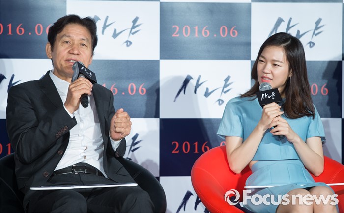 (서울=포커스뉴스) 30일 오전 서울 광진구 건대입구 롯데시네마에서 열린 영화 '사냥' 제작보고회에 참석한 배우 안성기(왼쪽)가 취재진의 질문에 답하고 있다. 왼쪽부터 배우 안성기, 한예리.