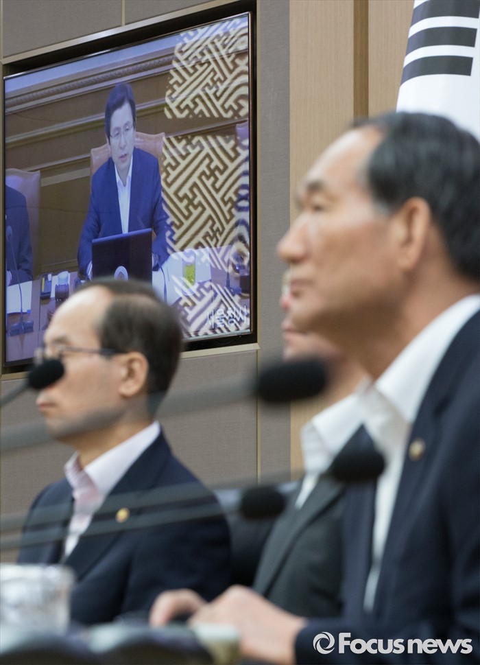 (세종=포커스뉴스) 31일 오전 세종시 정부세종청사 국무회의장에서 서울-세종 영상회의로 열린 국무회의에 참석한 박승춘(오른쪽) 국가보훈처장이 황교안 국무총리의 발언을 경청하고 있다.