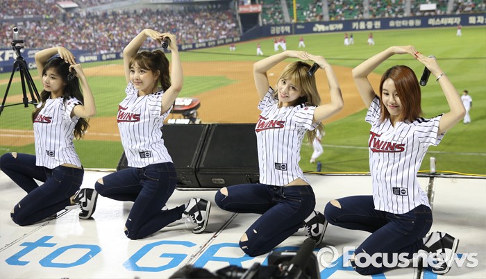 (서울=포커스뉴스) 31일 서울 잠실구장에서 열린 2016 프로야구 KIA-LG 경기에 인기 걸그룹 트와이스가 시구, 시타로 참여한뒤 경기 중간 응원단상에 올라 관중에게 노래와 춤을 선사하고 있다.
