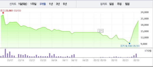 금융위원회는 “현재 진행되고 있는 현대상선의 용선료 협상은 의미 있는 진척을 보이고 있다”며 “그렇지만 일부 보도와 같이 용션료 협상이 사실상 타결되었다거나 다음주 초 발표할 예정이라는 내용은 사실이 아니다”라고 발표했다.주가흐름<사진출처=네이버 캡쳐>