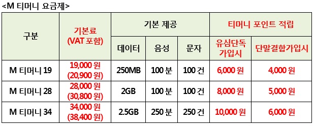 M 티머니34 요금제는 월 3만7400원(부가세 포함)에 LTE데이터 2.5GB, 통화 250분, 문자 250건과 함께 매월 1만 포인트가 제공된다. M 티머니19 요금제는 월 2만900원에 데이터 250MB와 통화 100분, 문자 100건과 함께 매월 6000 포인트가 제공된다.