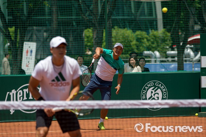 (서울=포커스뉴스) 이형택 전 테니스 국가대표가 1일 오후 서울 중구 서울광장에서 열린 '롤랑가로스(프랑스오픈) 인더시티'에서 대학생들과 스페셜 매치 시합을 하고 있다.