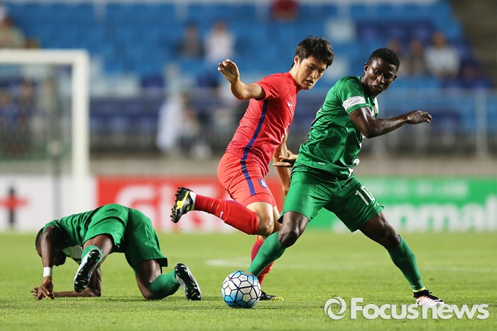 (수원=포커스뉴스) 2일 오후 경기 수원월드컵경기장에서 열린 2016 4개국 올림픽국가대표 축구대회 대한민국과 나이지리아의 경기에서 한국 박용우가 볼 경합을 하고 있다.