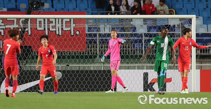 (수원=포커스뉴스) 2일 오후 경기 수원월드컵경기장에서 열린 2016 4개국 올림픽국가대표 축구대회 대한민국과 나이지리아의 경기에서 대한민국 구성윤(가운데)이 수비수 위치를 지시하고 있다.
