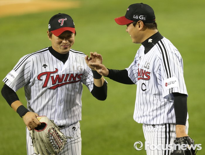 (서울=포커스뉴스) 2일 서울 잠실구장에서 열린 2016 프로야구 KIA-LG 경기에서 LG 투수 류제국이 7회 KIA 필의 타구를 펜스에 부딪히며 잡아낸 중견수 임훈과 손을 마주치고 있다.