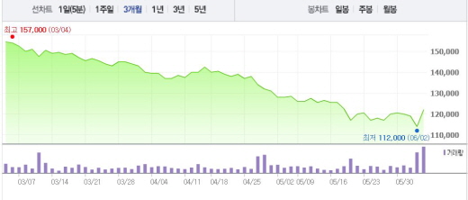 2일 종가인 16만7000원에서 시작한 주가는 장 초반 14만8000원까지 하락했다. 이후 오전 10시40분 16만500원까지 급격히 올랐다가 다시 15만원대 초반에서 오르내렸다.