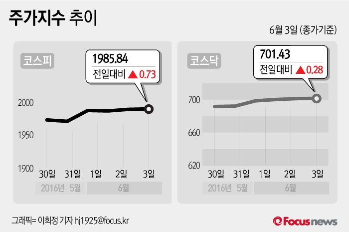 (서울=포커스뉴스) 3일 코스피지수는 전날 보다 0.04%(0.73포인트) 오른 1985.84에 장을 마쳤다. 코스닥지수는 전일 대비 0.04%(0.28포인트) 오른 701.43에 마감했다.