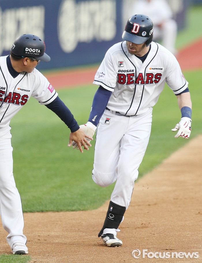 (서울=포커스뉴스) 3일 서울 잠실구장에서 열린 2016프로야구 SK-두산 경기 2회말 두산 에반스가 좌월 솔로 홈런을 치고 3루를 돌며 전형도 코치와 로우파이브를 하고 있다.