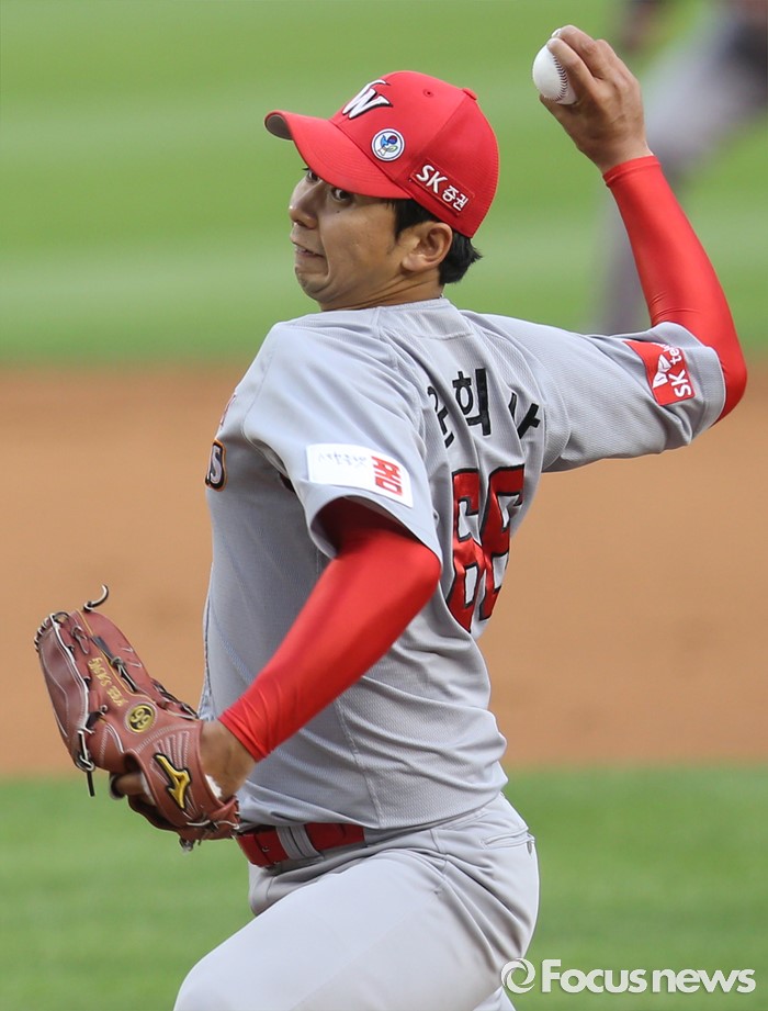 (서울=포커스뉴스) 3일 서울 잠실구장에서 열린 2016프로야구 SK-두산 경기에서 1회말 SK 선발투수 윤희상이 투구하고 있다.