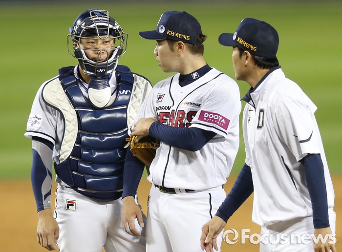 (서울=포커스뉴스) 3일 서울 잠실구장에서 열린 2016프로야구 SK-두산 경기에서 두산 투수 고원준이 5회 2사후 볼넷과 몸에 맞는 볼로 연속 진루시키자 한용덕 코치와 포수 박세혁이 마운드에 올라가 시간을 끌며 고원준을 안정시키고 있다.