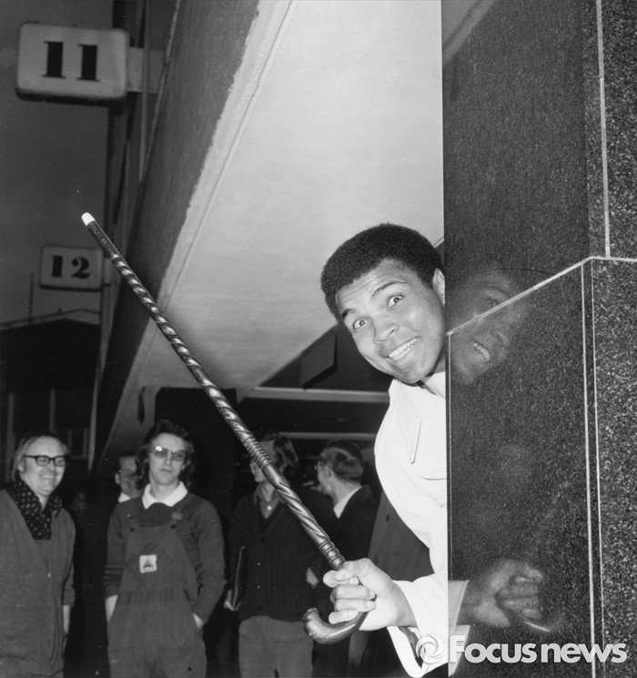 Heavyweight boxing champion Muhammad Ali peers out from behind a pillar brandishing an ivory-inlaid walking stick, 29th November 1974. (Photo by Evening Standard/Hulton Archive/Getty Images)
