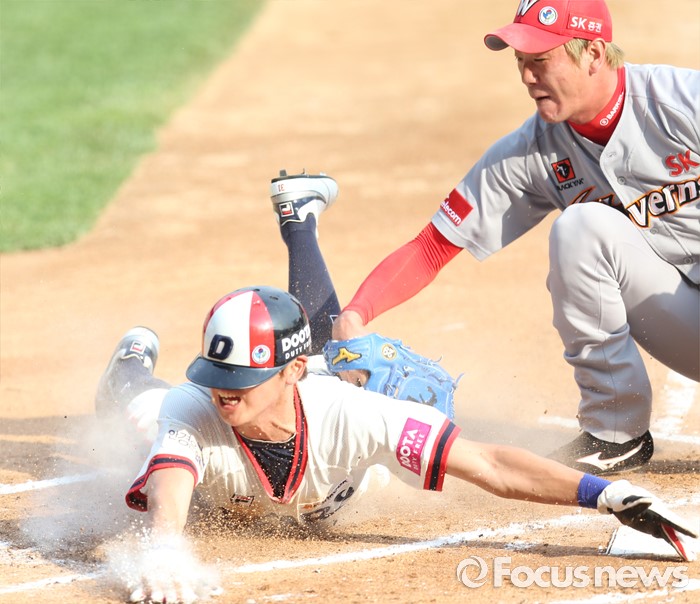 △ 실책을 틈타 홈을 파고드는 두산 정수빈