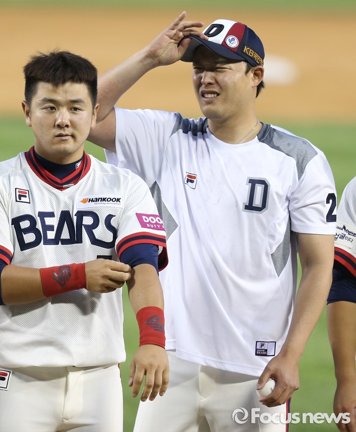 (서울=포커스뉴스) 5일 서울 잠실구장에서 열린 2016프로야구 SK-두산 경기에서 프로 진출 6년만에 첫 승을 올린 두산 투수 안규영이 감격에 겨워 눈시울을 붉히고 있다.
