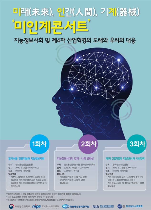 장석영 미래부 인터넷융합정책관은 “이번 행사는 지능정보기술에 의해 변화될 미래에 대해 전문가와 국민이 함께 생각해볼 수 있는 기회가 될 것”이라고 강조하고 “지속적으로 국민과 소통하면서 미래사회에 효과적으로 대응할 정책 마련을 위해 노력하겠다”고 밝혔다.미인계 콘서트 포스터.<사진제공=미래부>