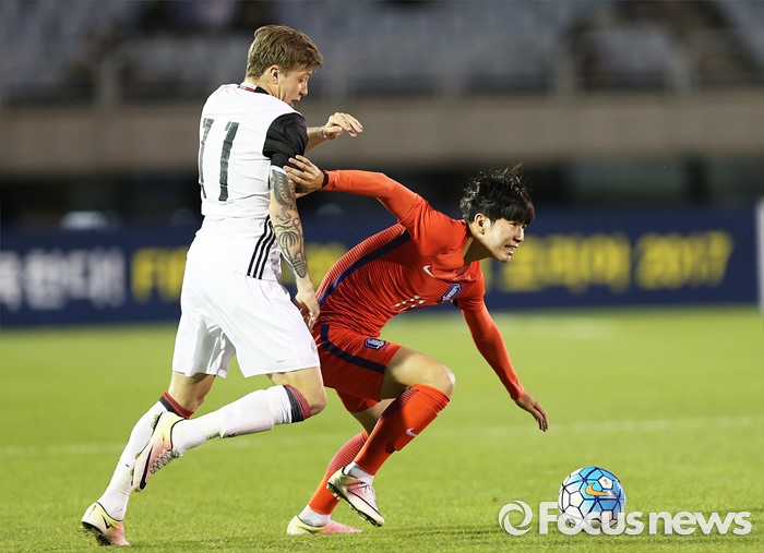 (부천=포커스뉴스) 6일 오후 경기 부천종합운동장에서 열린 2016 4개국 올림픽국가대표 축구대회 대한민국과 덴마크의 경기에서 대한민국 김승준이 상대 선수와 볼 다툼을 하고 있다.
