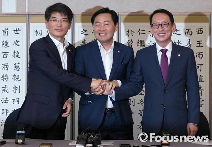 김관영 수석은 '원내대표간 논의로 이어질 수도 있느냐'는 질문에 "그럴 가능성이 전혀 없지는 않다"며 "상황을 봐서 각 당이 내부적으로 상의하고 원내대표끼리 필요하면 (회동을) 할 것"이라고 답했다.w6일 오후 서울 여의도 국회 귀빈식당에서 열린 20대 국회 원구성 협상 등을 위한 회동에 참석한 김도읍(오른쪽) 새누리당 원내수석부대표, 박완주(왼쪽) 더불어민주당 원내수석부대표, 김관영 국민의당 원내수석부대표가 취재진을 향해 포즈를 취하고 있다. 2016.06.06 박동욱 기자
