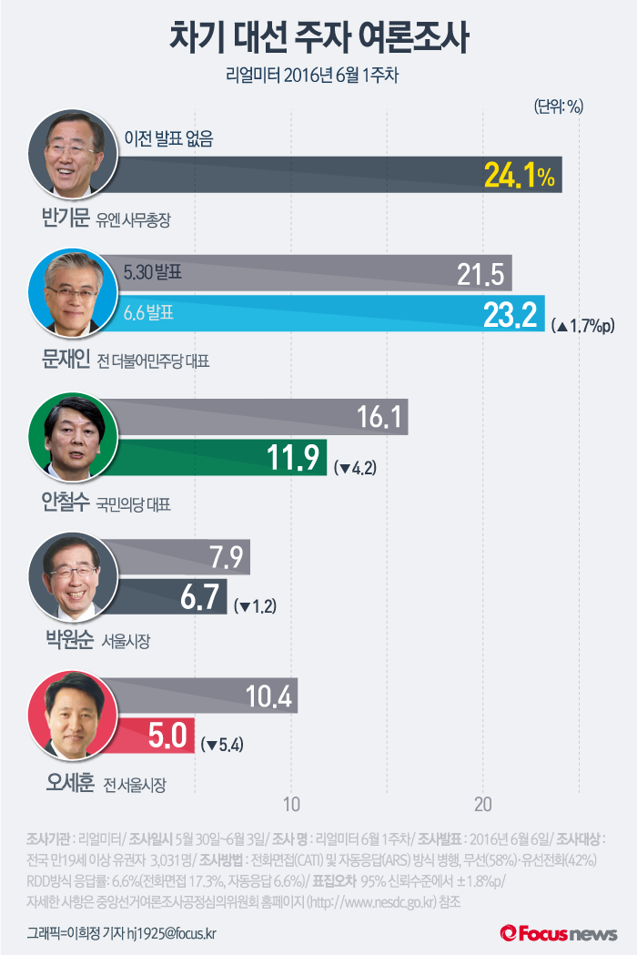 (서울=포커스뉴스) 여론조사 기관 리얼미터의 2016년 6월 1주차 주간집계에 따르면 반기문 총장이 처음으로 포함된 여야 차기 대선주자 지지도 조사에서 반 총장이 24.1%를 기록했다. 문재인 더불어민주당 전 대표는 0.9%p 차이로 오차범위 내인23.2%를 기록 반 총장과 양강구도를 형성했다.