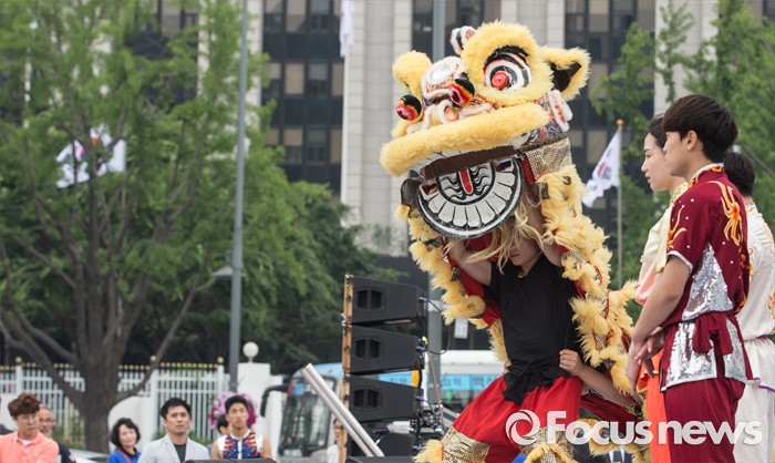 (서울=포커스뉴스) 7일 오후 서울 종로구 광화문 광장에서 열린 '2016 청주(충북) 세계무예마스터십 D-100성공기원행사'에 참여한 시범단이 사자춤을 선보이고 있다.