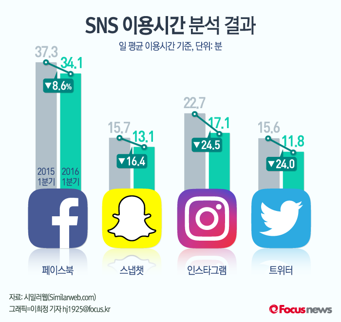 그 결과 일 평균 이용시간이 가장 많이 줄어든 앱은 인스타그램이었다. 인스타그램은 전년대비 24.5% 줄었다. 트위터는 24.0% 떨어지며 그 뒤를 이었고 스냅챗이 16.4%, 페이스북이 8.6%까지 감소했다.