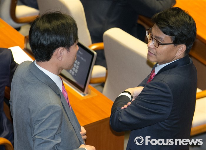 (서울=포커스뉴스) 9일 오후 서울 여의도 국회에서 열린 20대 국회 첫 본회의에 참석한 하태경(왼쪽) 새누리당 의원과 윤상현 무소속 의원이 대화하고 있다.