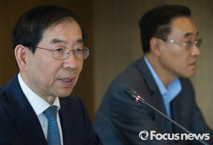 (서울=포커스뉴스) 박원순(왼쪽) 서울시장이 8일 오후 서울 중구 프레스센터에서 열린 2016 제1회 서울시 노사민정협의회 본회의에 참석해 인사말을 하고 있다. 서울시 노사민정협의회 구성 후 협의회구성원 모두가 한자리에 모이는 것은 15년 만이다.