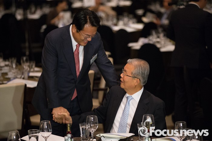 (서울=포커스뉴스) 9일 오후 서울 여의도구 63빌딩 그랜드볼룸에서 열린 '6.15 남북정상회담 16주년 기념식'에 참석한 정진석 새누리당 원내대표(왼쪽)와 김종인 더불어민주당 비상대책위원회 대표가 악수하고 있다.
