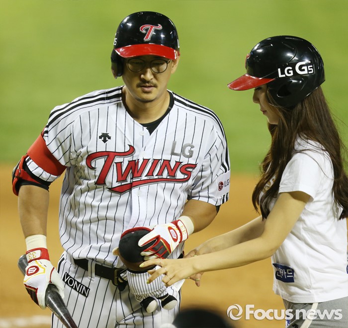 (서울=포커스뉴스) 8일 서울 잠실구장에서 열린 2016 프로야구 삼성-LG 경기 7회말 LG 박용택이 선두타자로 나와 우월 솔로 홈런을 치고 홈인하며 홈런 인형을 받고 있다.