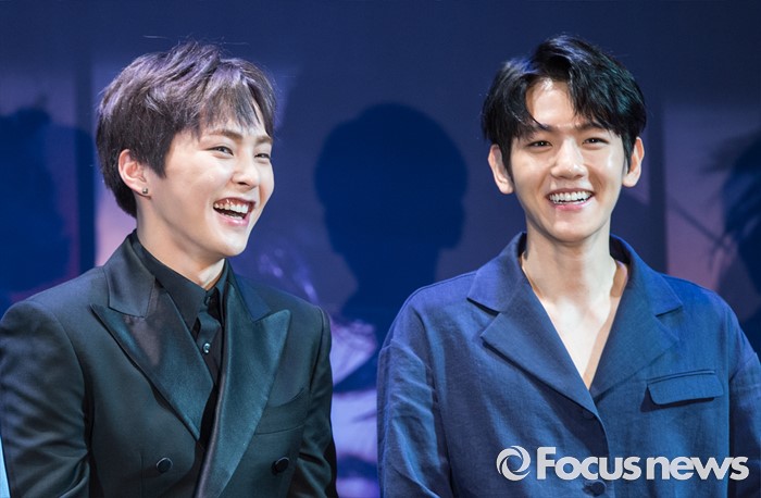 (서울=포커스뉴스) 8일 오전 서울 강남구 코엑스 아티움에서 열린 아이돌 그룹 엑소의 3집 앨범 'EX'ACT' 발표 쇼케이스에 참석한 멤버 시우민(왼쪽)과 백현이 미소를 짓고 있다.