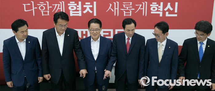 (서울=포커스뉴스) 8일 오후 서울 여의도 국회 새누리당 원내대표실에서 20대 국회 원구성 협상 등을 위한 3당 원내지도부 회동에 참석한 의원들이 포즈를 취하고 있다. 오른쪽부터 박완주 더불어민주당 원내수석부대표, 김도읍 새누리당 원내수석부대표, 우상호 더불어민주당 원내대표, 박지원 국민의당 원내대표, 정진석 새누리당 원내대표, 김관영 국민의당 원내수석부대표.