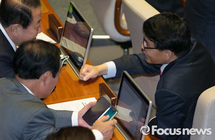 (서울=포커스뉴스) 9일 오후 서울 여의도 국회에서 열린 20대 국회 첫 본회의에 참석한 윤상현(오른쪽) 무소속 의원이 동료 의원들과 대화하고 있다.