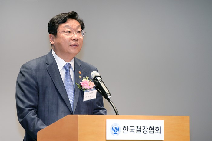 (서울=포커스뉴스) 주형환 산업통상자원부 장관이 9일 서울 포스코센터 서관 아트홀에서 열린 제17회 철의 날 기념식에 참석해 축사를 하고 있다.
