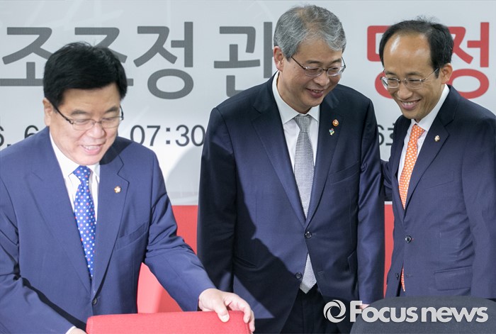 (서울=포커스뉴스) 9일 오전 서울 여의도 국회에서 열린 산업·기업 구조조정 관련 당정간담회에 참석한 김광림(왼쪽) 새누리당 정책위의장, 추경호(오른쪽) 의원이 임종룡 금융위원장과 기념촬영한 뒤 자리로 향하고 있다.