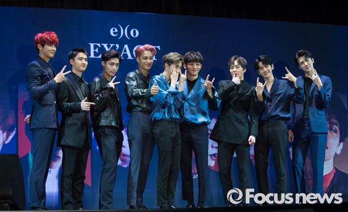 (서울=포커스뉴스) 8일 오전 서울 강남구 코엑스 아티움에서 열린 아이돌 그룹 엑소의 3집 앨범 'EX'ACT' 발표 쇼케이스에 참석한 멤버들이 포토타임을 갖고 있다.