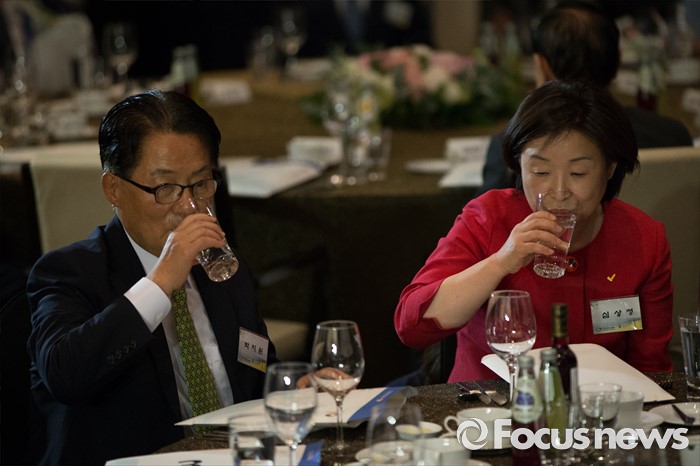 (서울=포커스뉴스) 9일 오후 서울 여의도구 63빌딩 그랜드볼룸에서 열린 '6.15 남북정상회담 16주년 기념식'에 참석한 박지원 국민의당 원내대표(왼쪽)와 심상정 정의당 대표가 물을 마시고 있다.