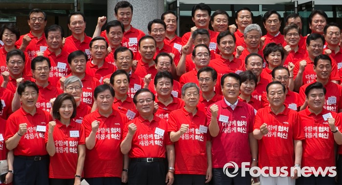 (과천=포커스뉴스) 10일 오전 경기도 과천 국가공무원인재개발원에서 열린 2016 새누리당 정책워크숍에 참석한 김희옥 혁신비대위원장, 정진석 원내대표이 기념촬영을 하고 있다.