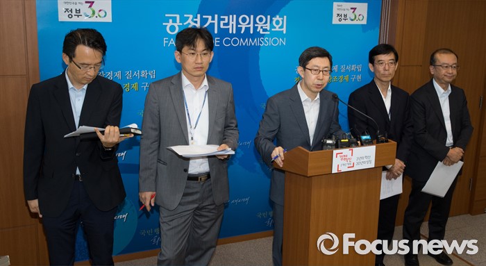 (세종=포커스뉴스) 신영선 공정거래위원회 사무처장이 8일 오전 세종시 정부세종청사 공정위 기자실에서 대기업집단 지정제도 개선방안에 대한 브리핑을 하고 있다. 왼쪽부터 박춘호 기획재정부 법인세제과장, 이병원 기획재정부 기업환경과장, 신영선 사무총장, 김병근 중소기업청 중소기업정책국장, 원동진 산업통상자원부 산업정책관.