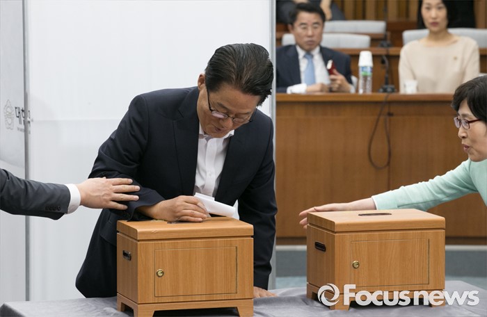 (서울=포커스뉴스) 9일 오전 서울 여의도 국회에서 국회 부의장 후보 선출을 위해 열린 국민의당 의원총회에 참석한 박지원 원내대표가 투표 중 발을 헛디뎌 휘청거리고 있다. 이날 국민의당은 국회 부의장 후보로 박주선 의원을 선출했다.